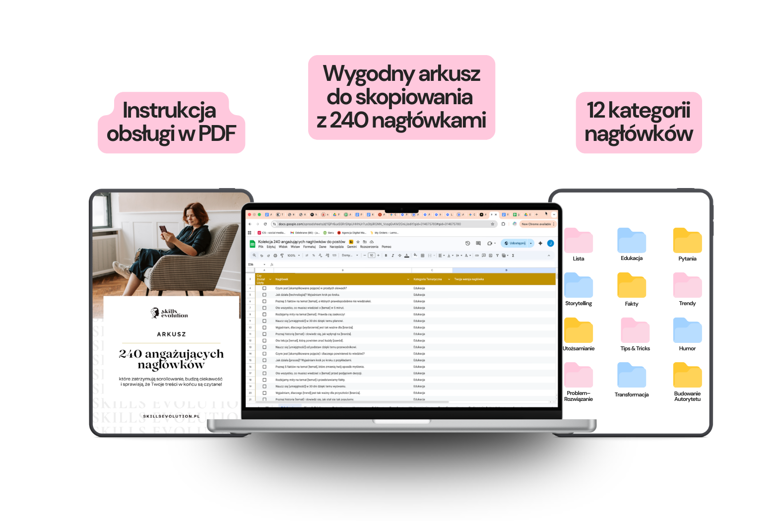 Ta kolekcja to 240 gotowych nagłówków, które zatrzymują scrollowanie, budzą ciekawość i sprawiają, że Twoje treści w końcu są czytane – a nie tylko publikowane.